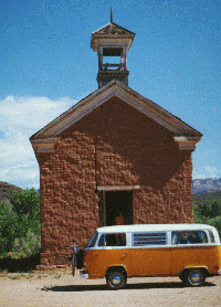 Old Yeller in front of an old church near Zion National Park. This was in the little ghost town were Butch Casity and the Sundance Kid was filmed!