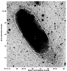 The outer contour is at a surface brightness of 26.54 magnitudes/arcsec^2