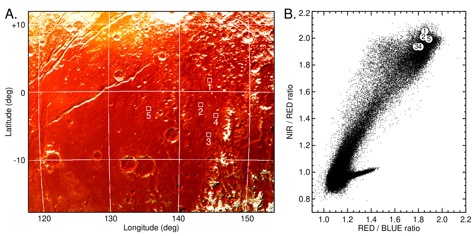 Fig. 6. A: hard stretch on the P_COLOR_2 observation of Cthulhu, with five regions of interest (ROIs) identified. ROIs 1-3 are topographic lows showing slightly darker shades. ROI 4 is a plains region that is slightly more pale. ROI 5 is near the center of a region of maximum redness identified by Olkin et al. (2017). B: color ratio plot, showing the mixing curve between Cthulhu colors at upper right and more typical Pluto colors at lower left, as well as the colors of the five ROIs, which are among the reddest colors seen on Pluto's encounter hemisphere