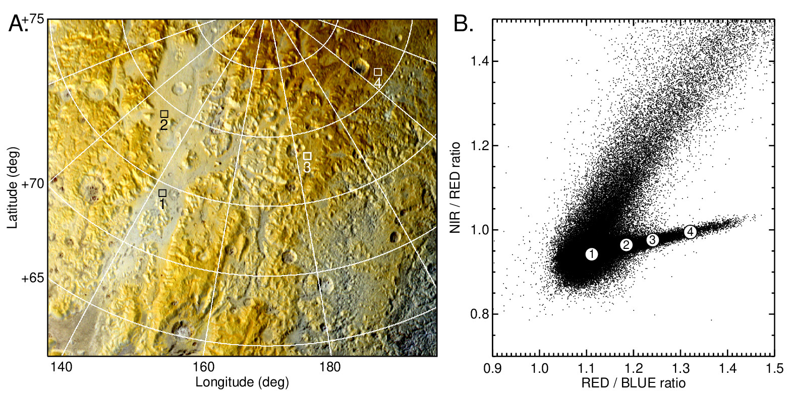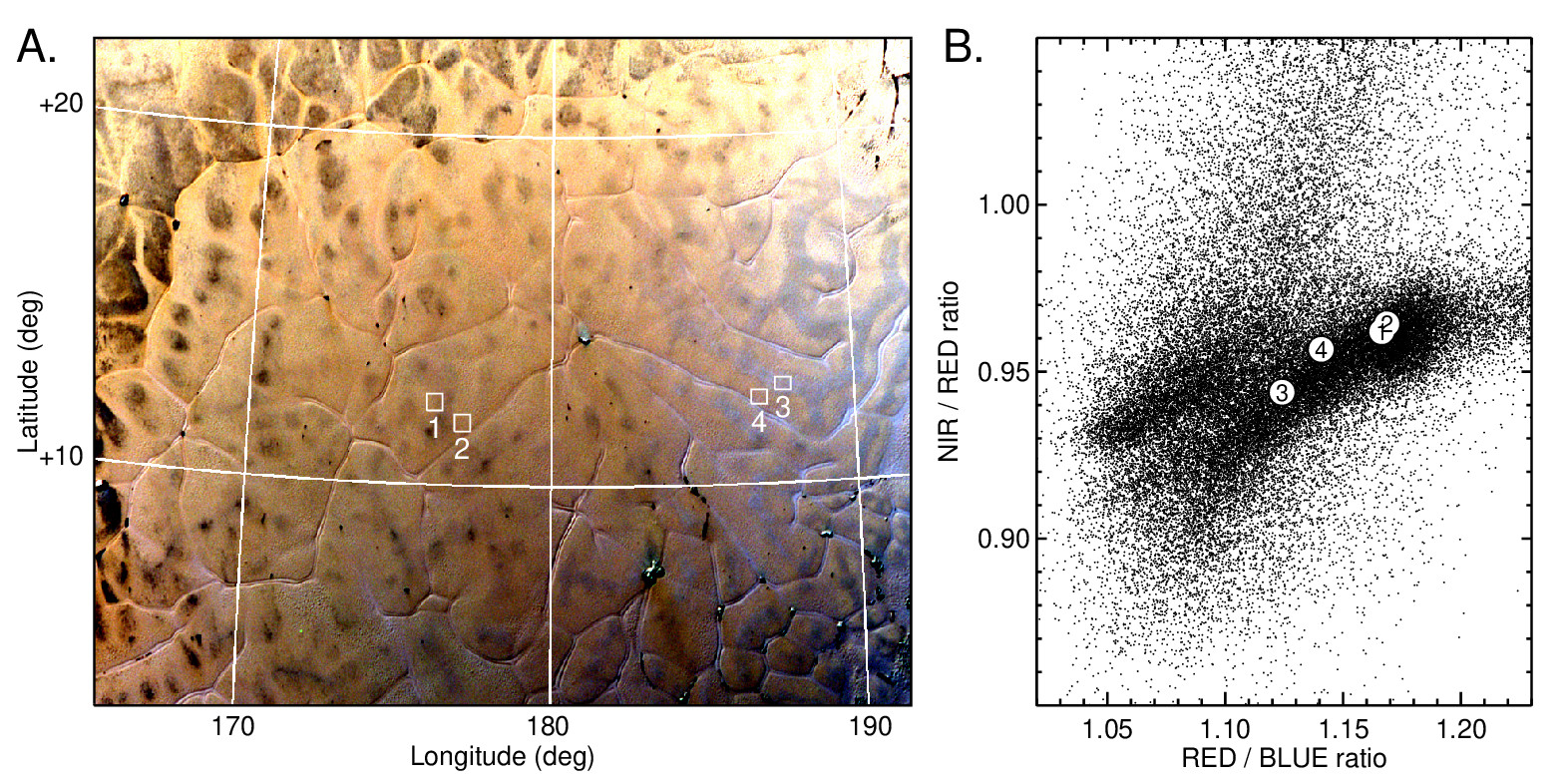 Fig. 9. A: Hard stretch of P_COLOR_2 showing convection cells in Sputnik Planitia, with ROIs selected to search for color contrasts between younger, up-welling zones in the centers of cells (ROIs 1 and 3) and older, down-welling zones near their peripheries (ROIs 2 and 4). B: Color ratio plot zoomed in on the dense clump of near-neutral bulk Pluto colors.