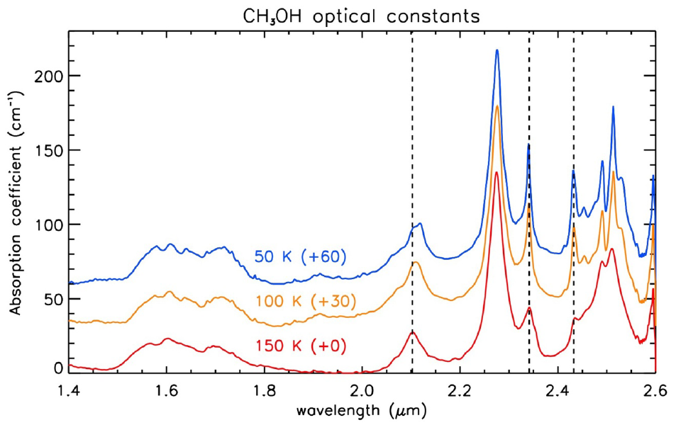 Fig. A1. The optical constants for CH3OH-ice measured at 50 K (blue), 100 K (orange) and 150 K (red). We offset the optical constants for clarity. Vertical dashed lines at 2.1025, 2.3415 and 2.4325 µm mark the center of several temperature-sensitive lines.