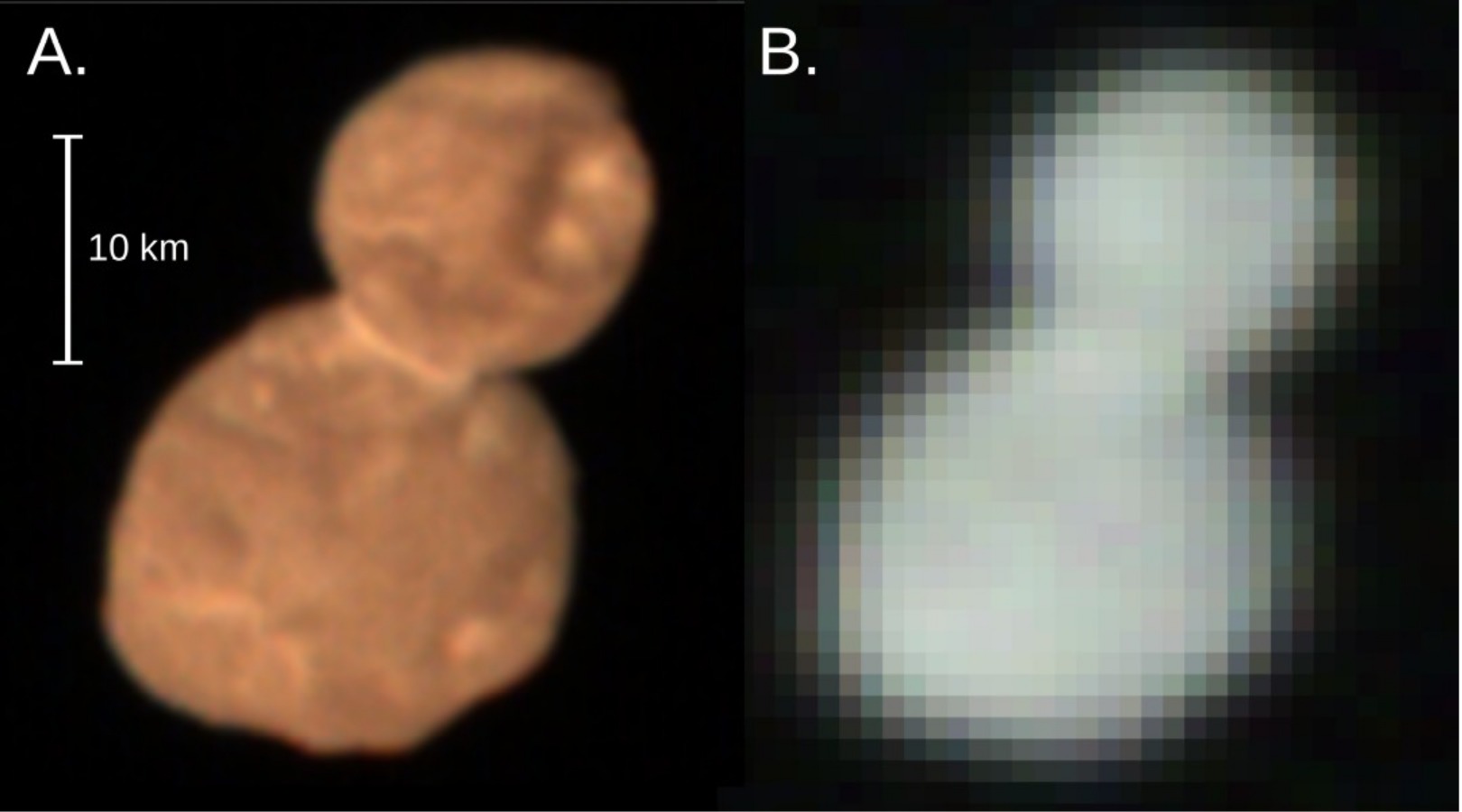 Visible and near-infrared wavelength views of Arrokoth. (A) Blue, green, and red channels show wavelengths 0.40 to 0.55 μm, 0.54 to 0.70 μm, and 0.78 to 0.98 μm, respectively. (B) These channels show wavelengths 1.2 to 1.6 μm, 1.6 to 2.0 μm, and 2.0 to 2.5 μm, respectively.